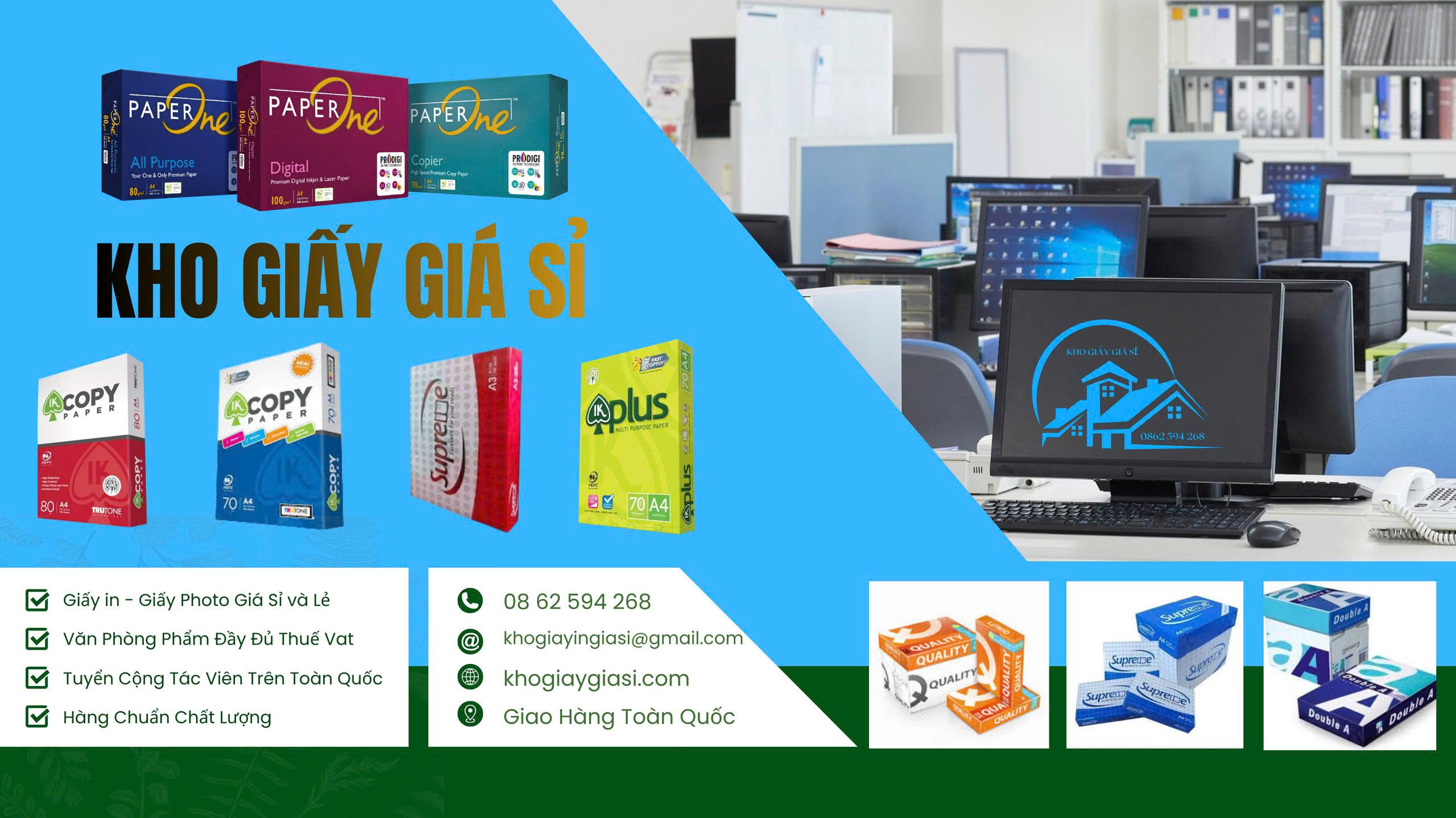 Chúng tôi cung cấp giấy in A4, A3, giấy photo chất lượng cao; đa dạng văn phòng phẩm; cùng băng keo các loại với giá cạnh tranh. Hàng luôn sẵn kho, giao nhanh, hỗ trợ tận tâm.